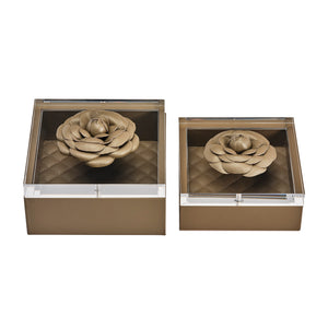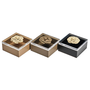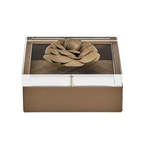 Crafted in Italy, this box demonstrates leather's often-overlooked versatility. The diamond-quilted, padded gray leather interior provides a timeless textural contrast to the sleek leather of the exterior. Atop the clear acrylic lid is a handcrafted camellia in the same timeless gray leather. An elegant decor item, the box also serves as a lovely holder for jewelry or other small items.