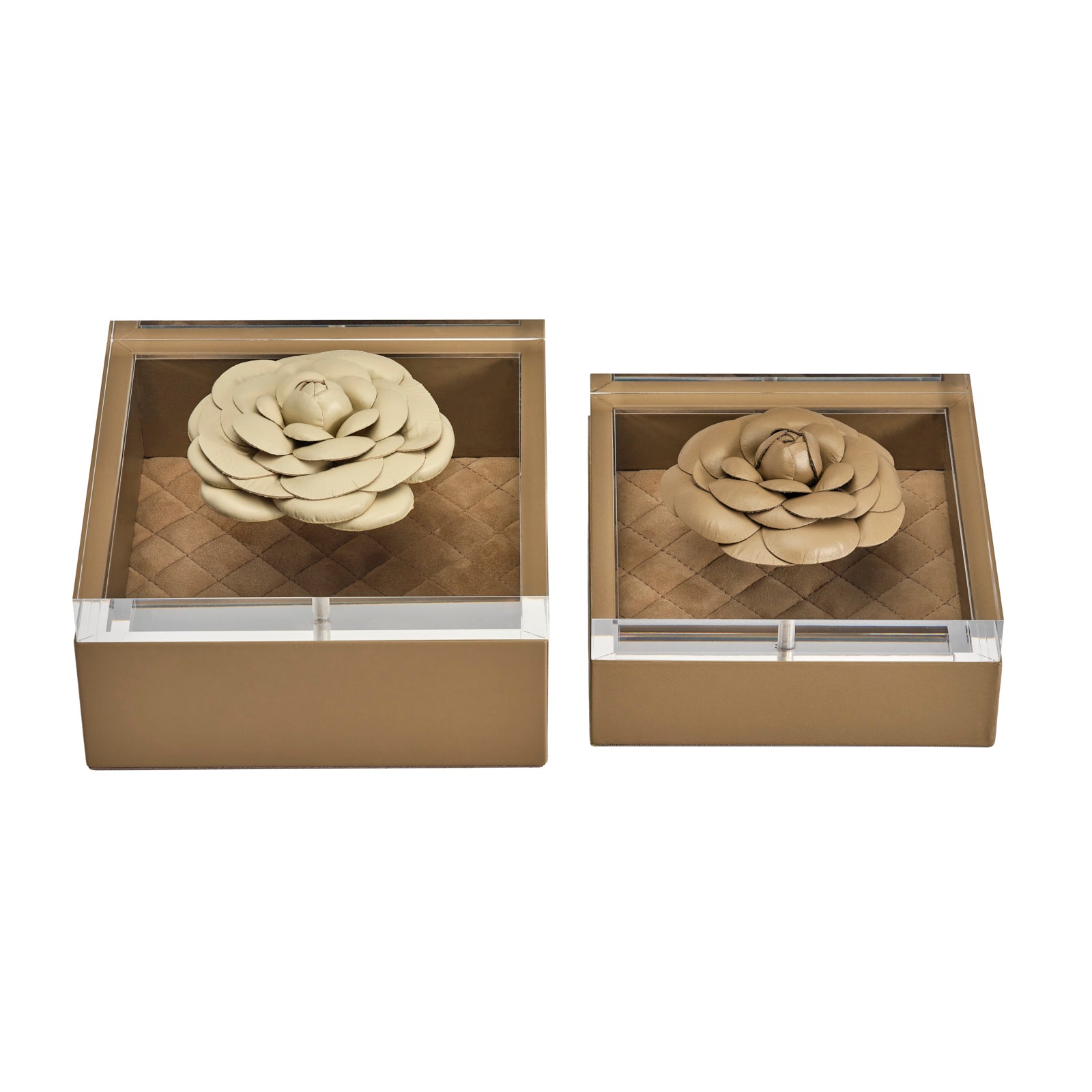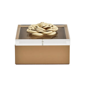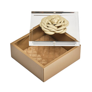 Crafted in Italy, this box demonstrates leather's often-overlooked versatility. The taupe leather of the interior provides a timeless textural contrast to the sleek leather of the exterior. Atop the clear acrylic lid is a handcrafted leather camellia, whose ivory hue complements the taupe of the base. An elegant decor item, the box also serves as a lovely holder for jewelry or other small items.