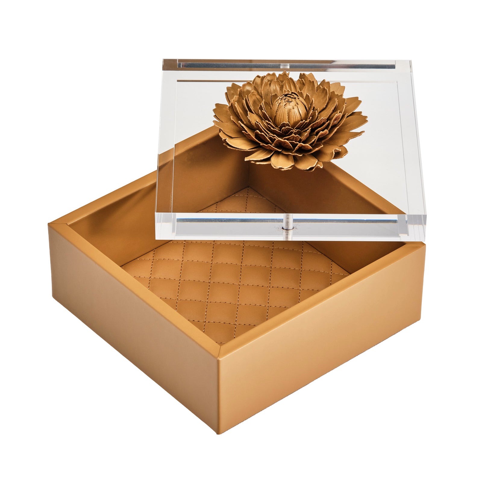 The impeccably detailed leather dahlia adorning the acrylic lid is just one element that gives this box its luxe sophistication. Handcrafted in Italy of cappuccino-brown leather, the box has a diamond-quilted, padded interior that adds to the sumptuousness while protecting any valuables you place inside.