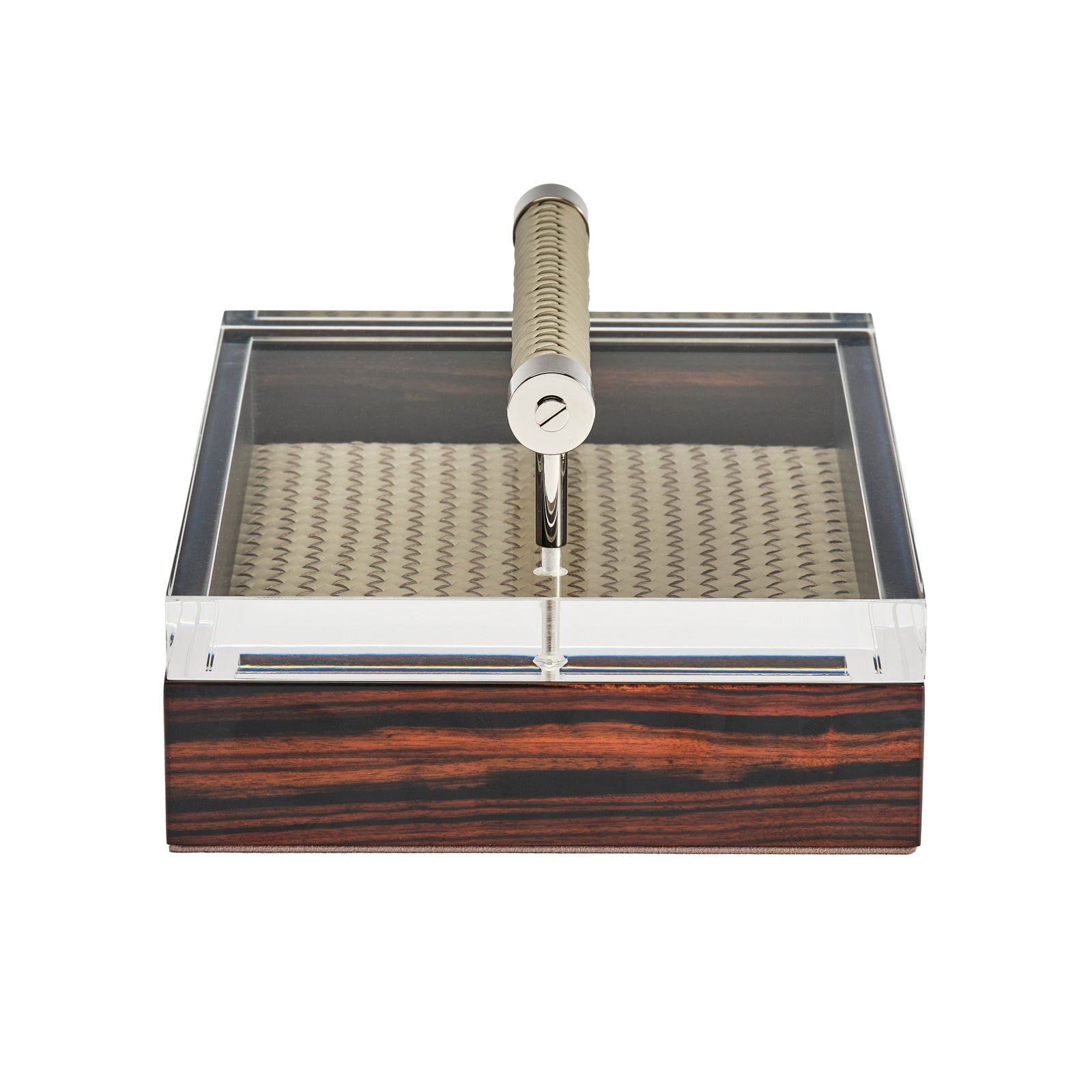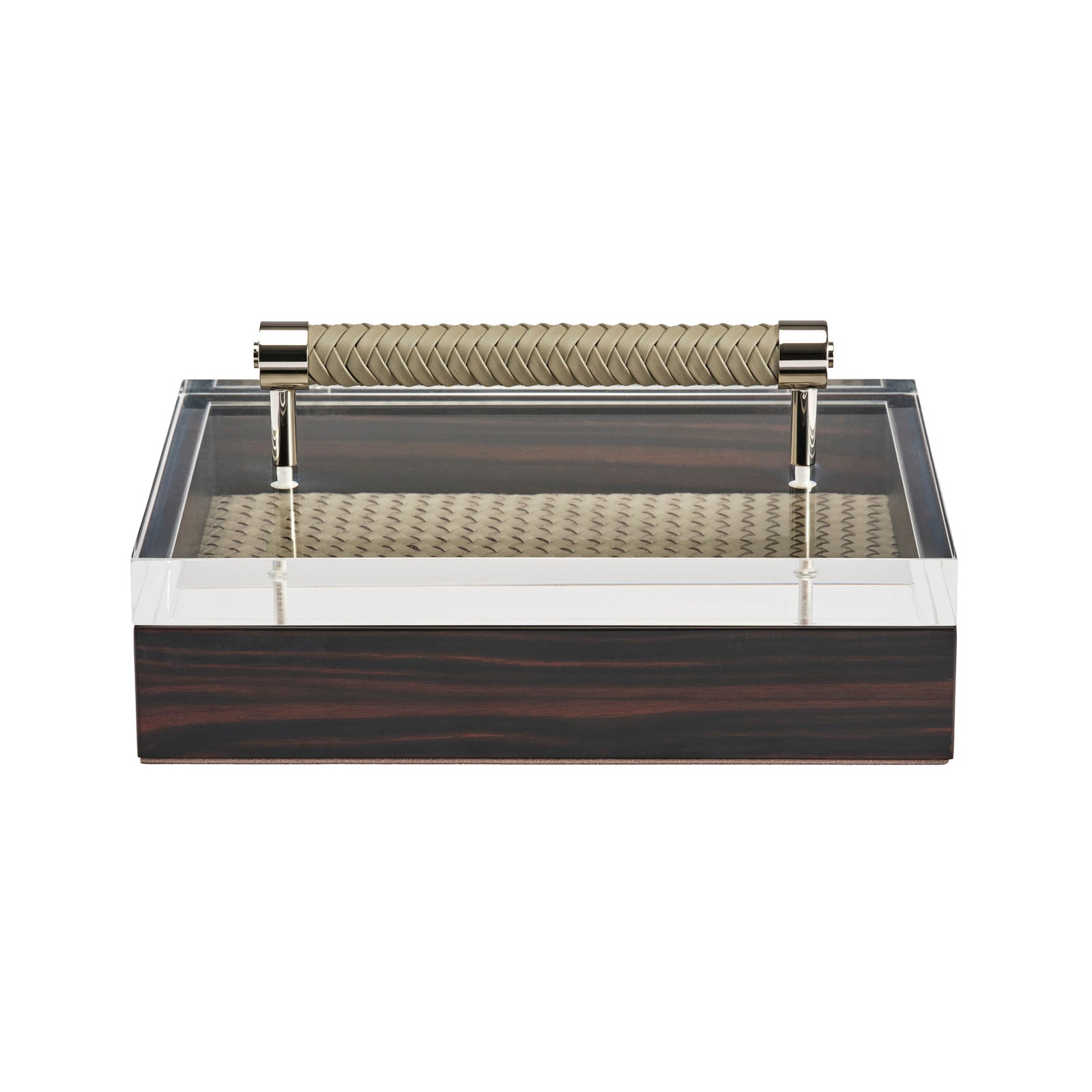 Richly figured macassar ebony, polished to a dazzling sheen, forms the exterior of this luxurious box. The handwoven and padded leather interior adds to the sumptuousness while protecting any valuables you place within. The box's lid is equally sophisticated: Made of exceptional-quality acrylic, it boasts a handle of woven leather and gleaming chrome.