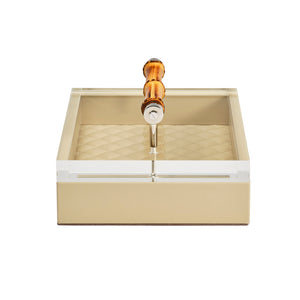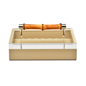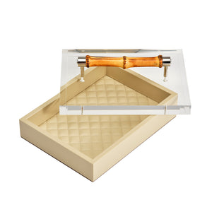Both eye-catching and utilitarian, this ivory leather box with lid will elevate an entry table, a nightstand, or a desktop with equal aplomb. The handcrafted box's interior is padded and quilted to protect any valuables placed within. The bamboo handle, accented with chrome, brings organic warmth to the coolly contemporary acrylic lid.