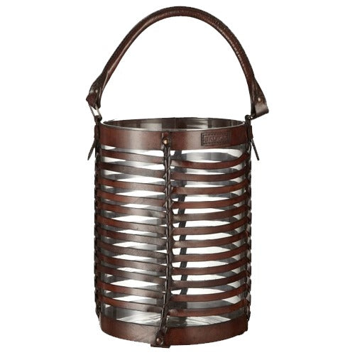 No mere utilitarian lantern, this accent piece gains much of its sophistication from the use of supple leather to form its symmetrical cage and handle. Polished chrome hardware provides an urbane contrast to the rich black leather. Designed to hold a candle, the glass vessel within the cage can also serve as a vase or a catchall.
