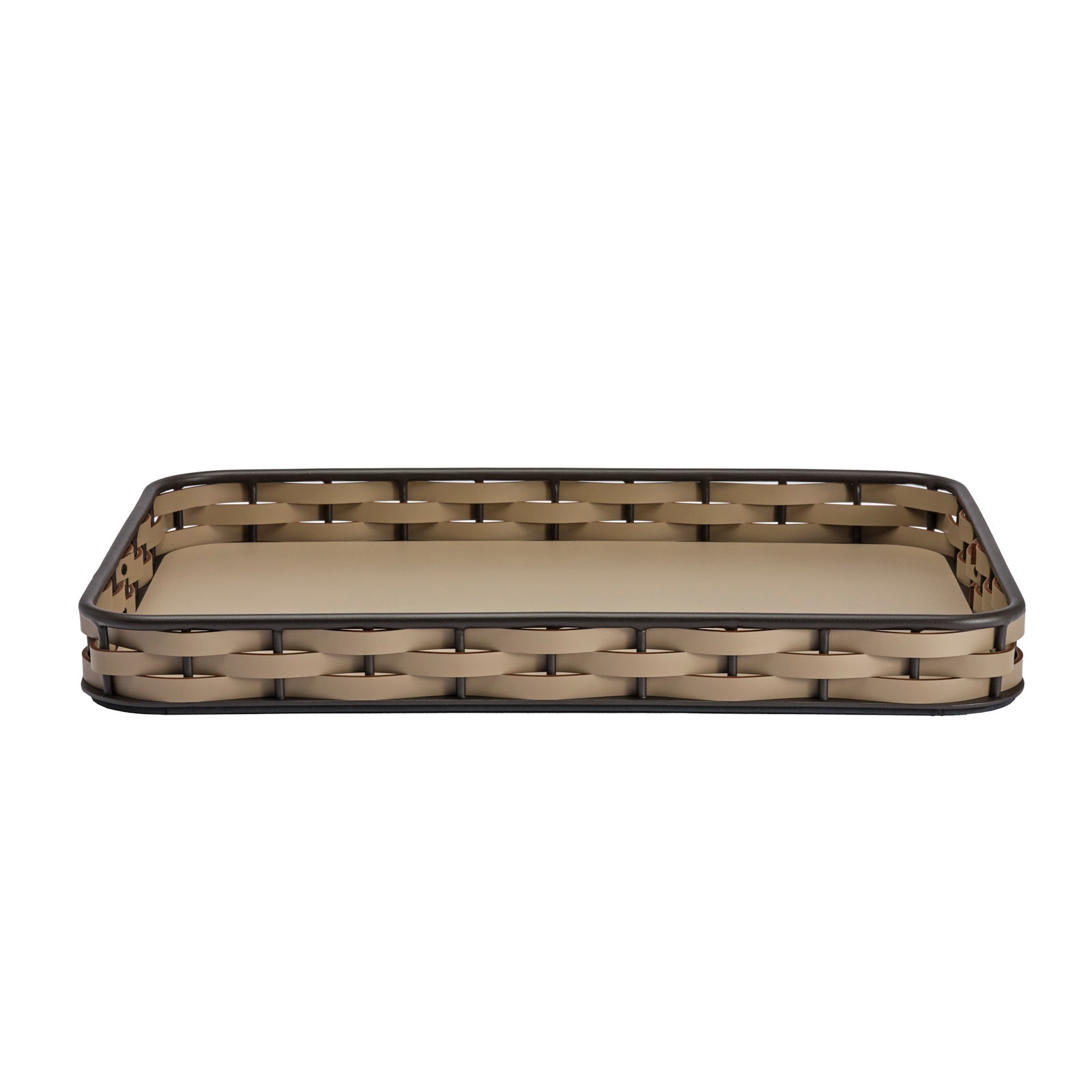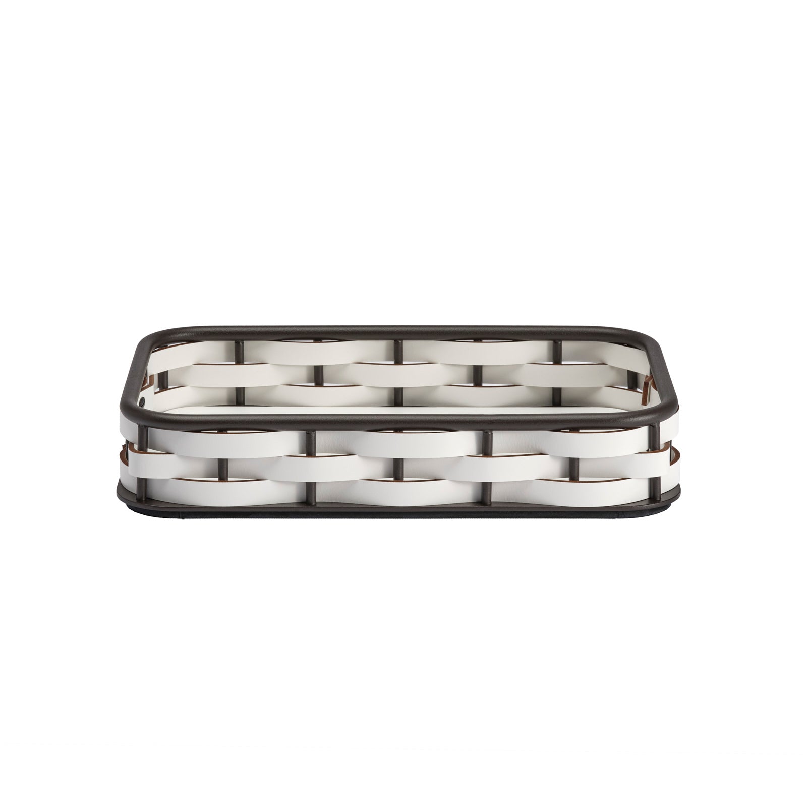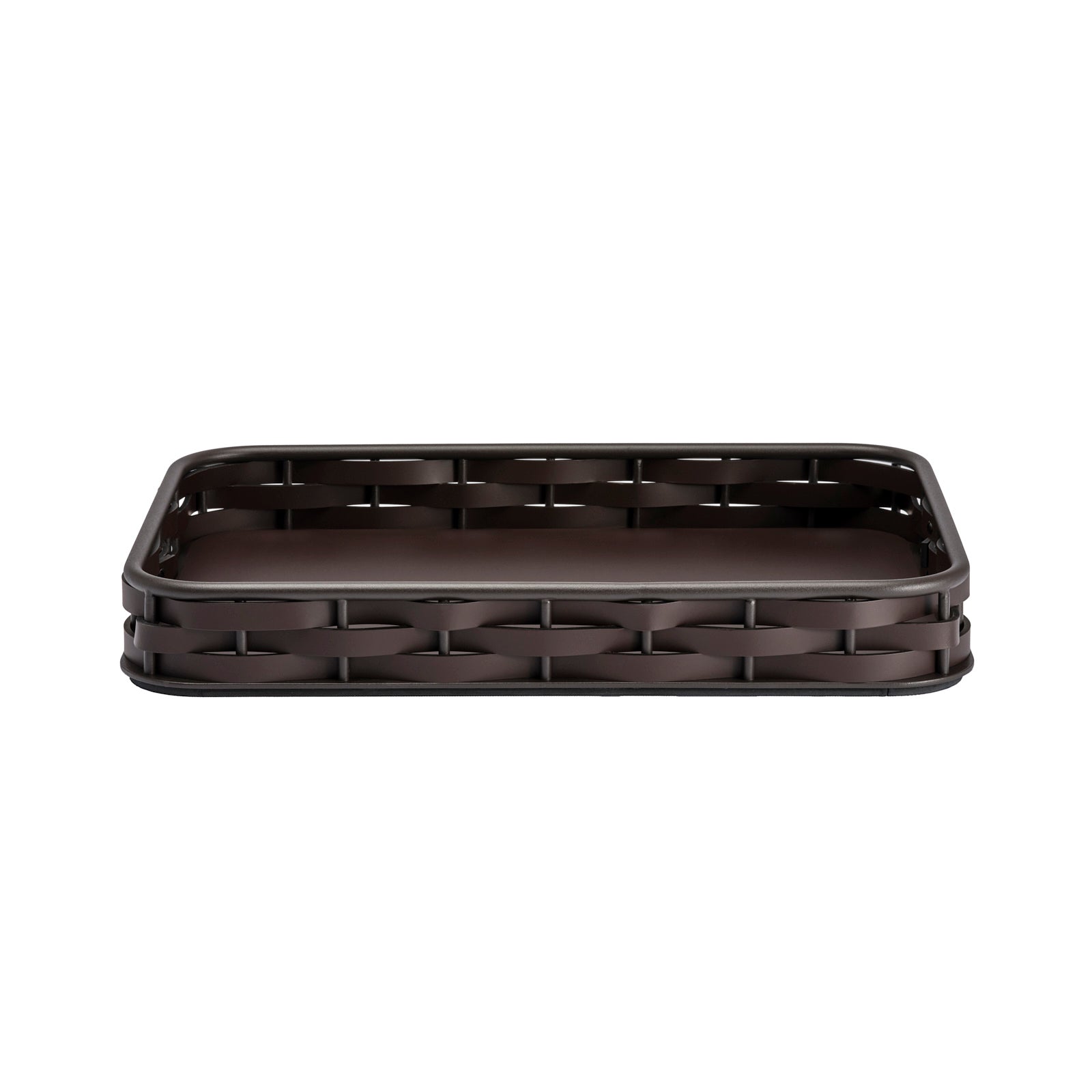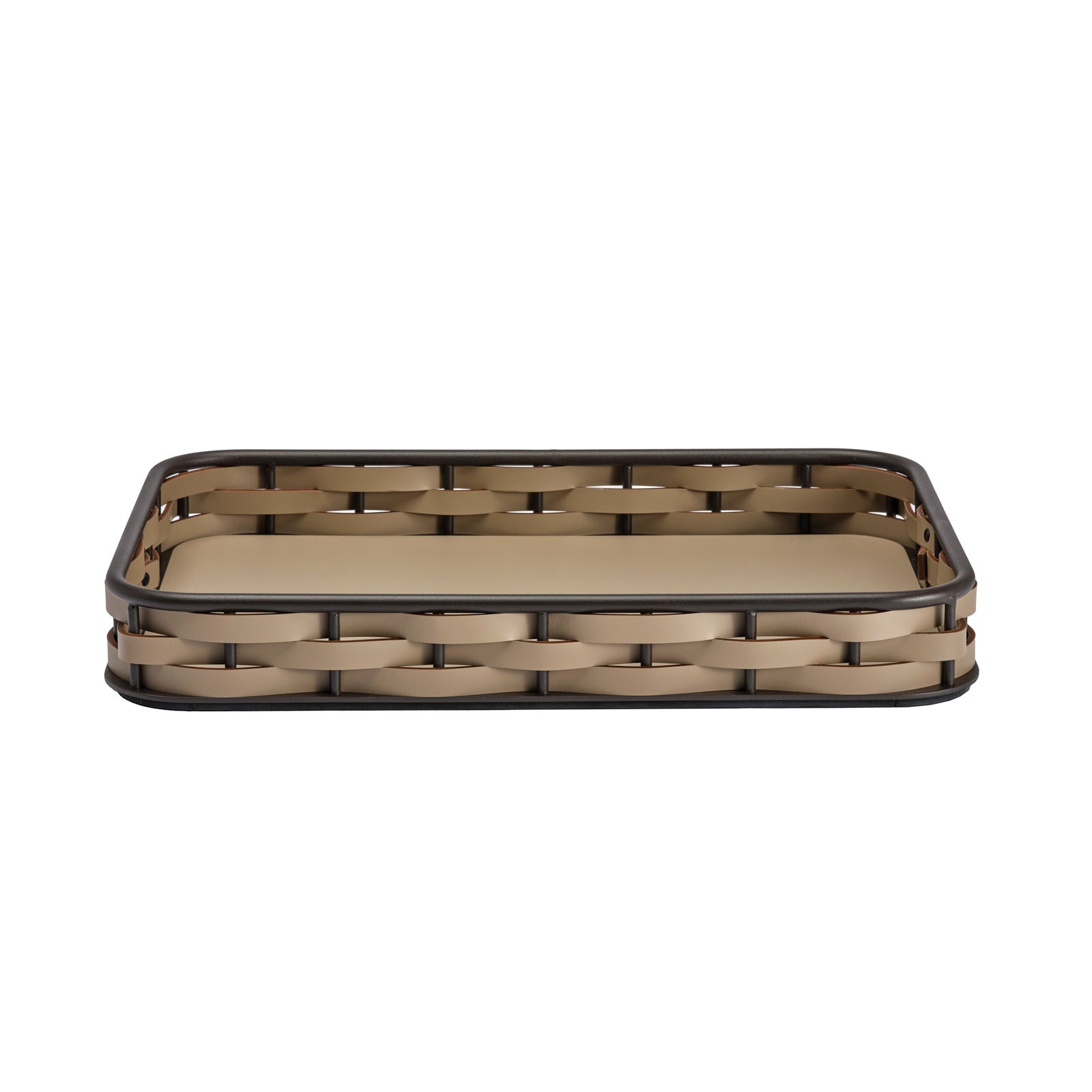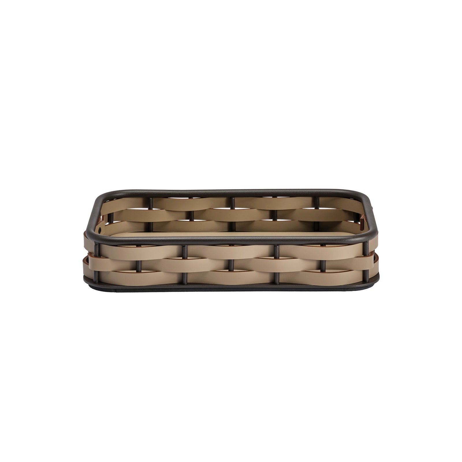 Handcrafted in Italy, this large rectangular tray pairs sustainability with undeniable luxury. Strips of rich brown regenerated leather made from production castoffs are woven around an aluminum frame, providing a textural contrast while paying homage to time-honored artisanal techniques. Because the leather is water-resistant and UV-resistant, the tray is durable and practical as well as timelessly chic.