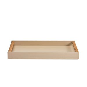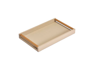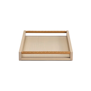 Handles handwoven of sumptuous brown leather complement this tray's pale ashwood body. Handcrafted in Italy, the tray will bring organic warmth and undeniable elegance to a vanity, a nightstand, or a coffee table.