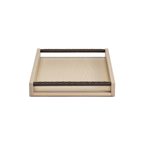 Handles handwoven of sumptuous brown leather complement this tray's pale ashwood body. Handcrafted in Italy, the tray will bring organic warmth and undeniable elegance to a vanity, a nightstand, or a coffee table.