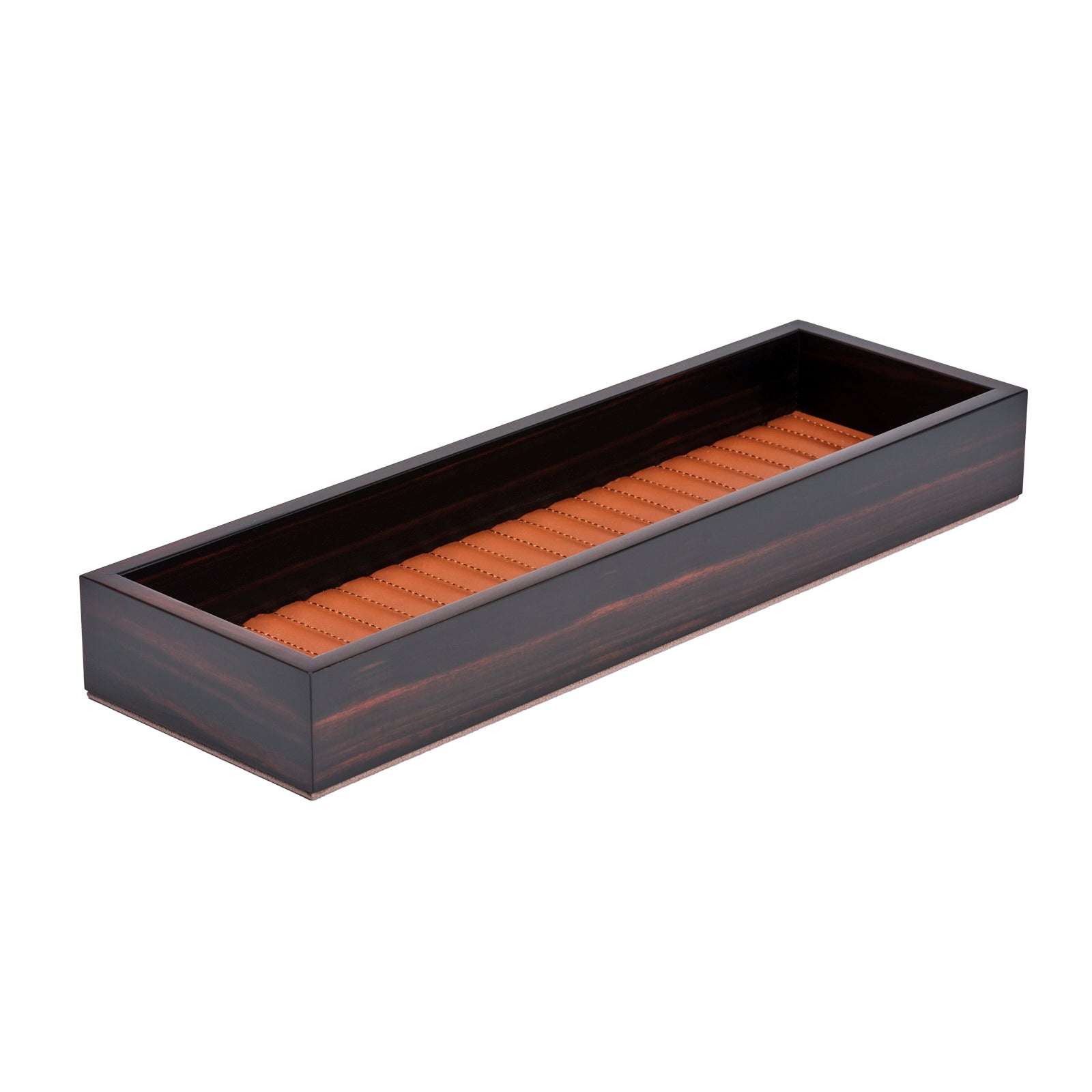 Quilted leather in warm siena brown graces the interior of this handsome valet tray, complementing the lavishly figured macassar ebony frame. Handcrafted in Italy, the tray is equally at home on a bedroom dresser and atop a desk.