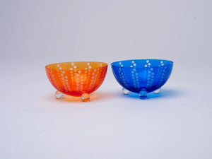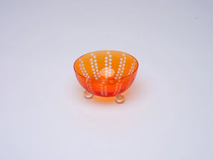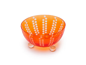 This lead-free crystal bowl is a dazzling combination of age-old artisanal techniques and contemporary design. Czech artisanas hand-engraved the clear bubble-like motif on the mouth-blown orange glass. The clear round feet echo the engraved design while adding more than a dash of whimsy.