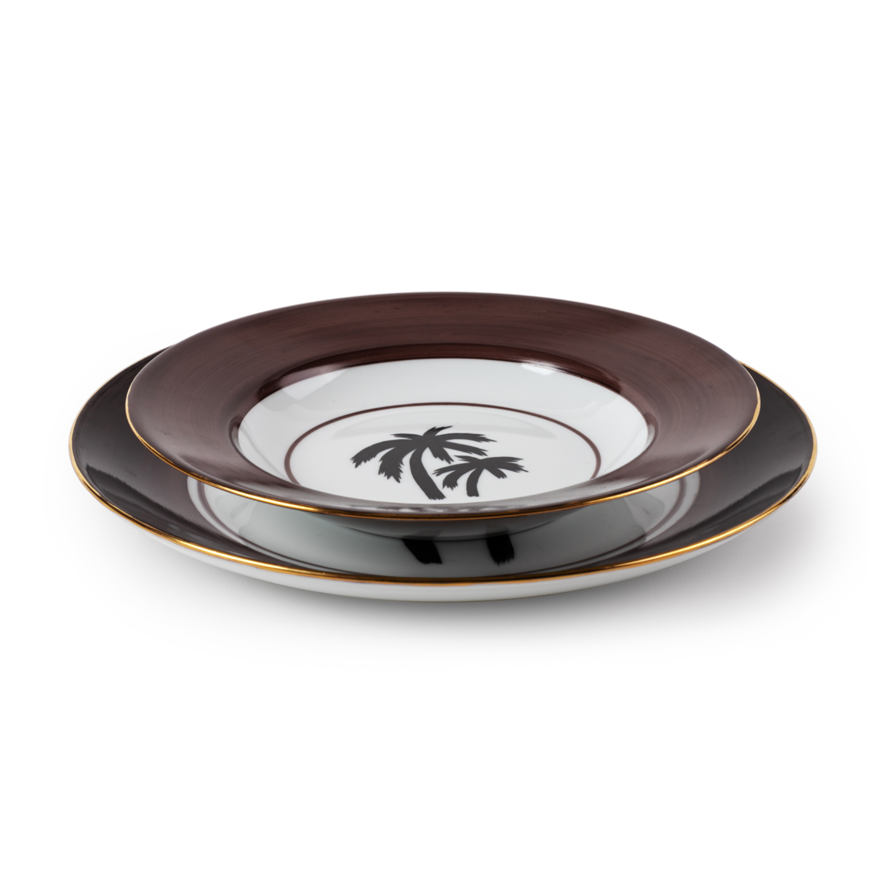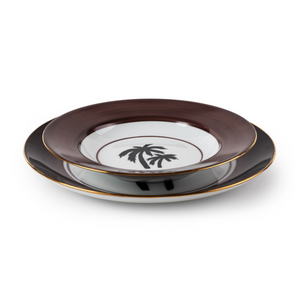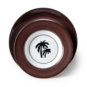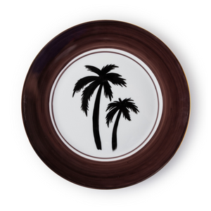 Dine among palm trees wherever you are, courtesy of this hand-painted salad plate by Molecot. Crafted in Spain from pristine Limoges porcelain, the plate surrounds the palm trees with a broad painterly swath of rich chocolate brown. The gold-rimmed edge amplifies the luxuriousness.