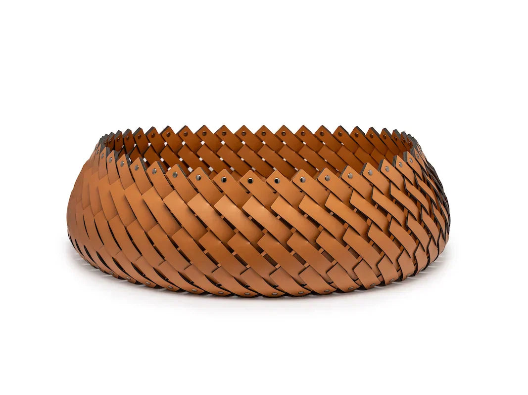 Functional and sumptuously soft, this handwoven basket transforms utilitarian storage into a luxury object worthy of display. Made of eco-friendly regenerated leather suitable for outdoor as well as indoor use, and it's large enough to hold sunscreen by the pool, shoes in the entry, or pillows and throws just about anywhere.