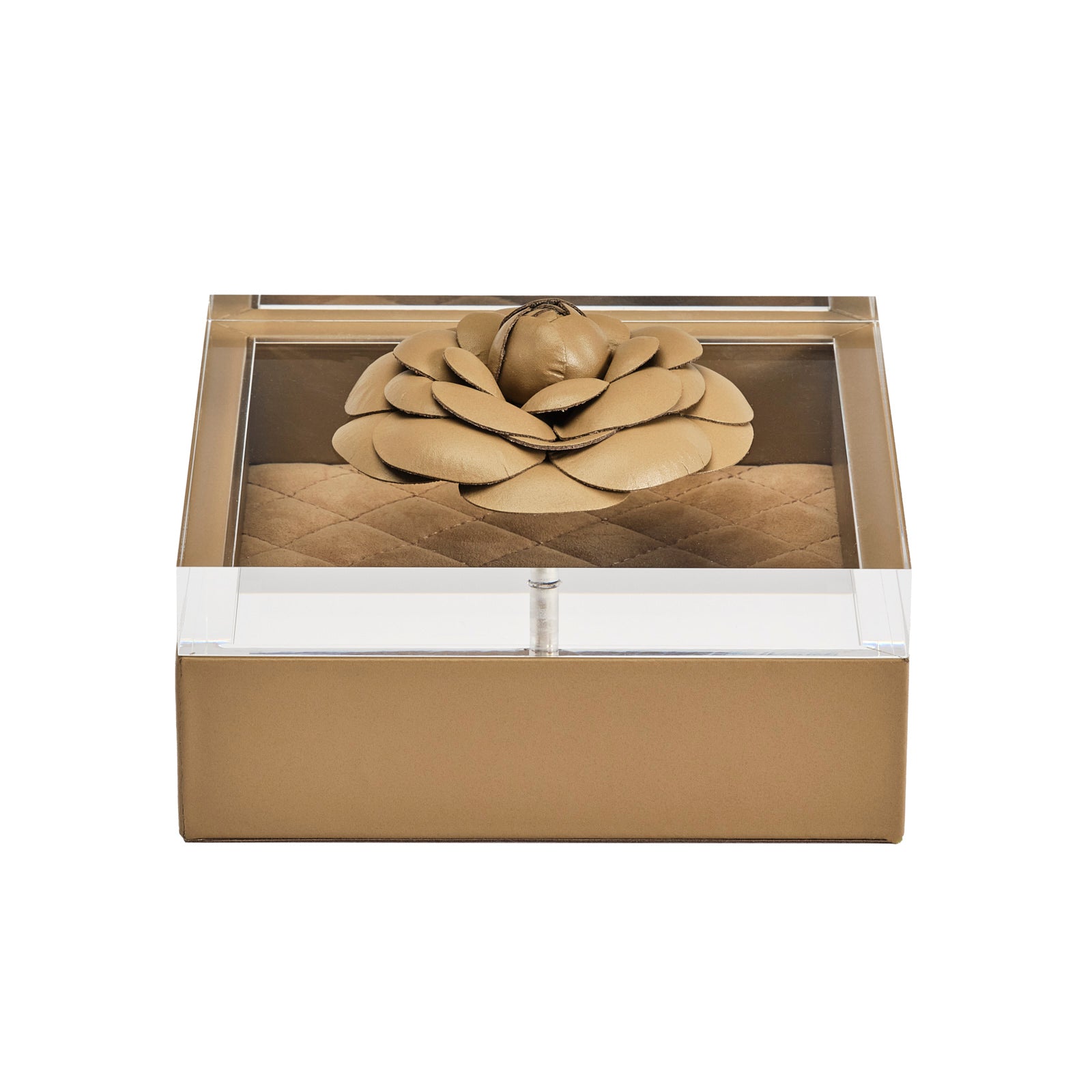 Crafted in Italy, this petite box shows off the versatility of fine leather. The smooth exterior of the leather box complements the diamond-quilted interior, which is soft enough to protect any treasures you place within. A handcrafted camellia, made of the same sumptuous taupe leather as the box itself, tops the clear acrylic lid.